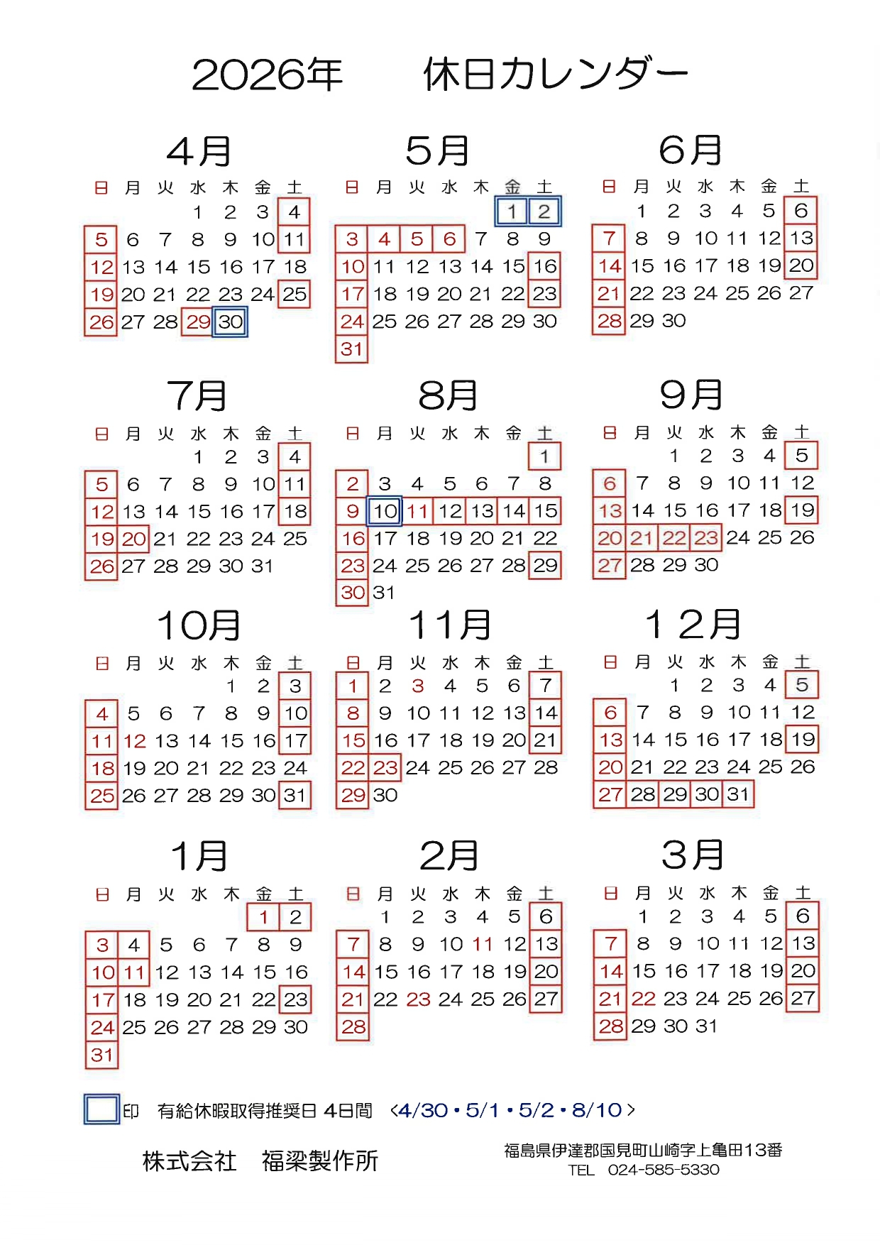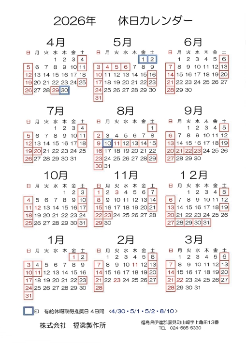 2026年度 会社カレンダー(4月はじまり)